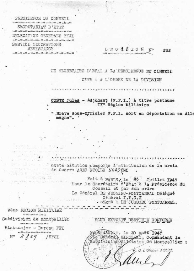 Interné au fort Saint-Nicolas à Marseille, puis au fort de Vancia dans l’Ain, Jules Coste est écroué à la maison d’arrêt de Nîmes, jugé par la section spéciale de la cour d’appel et condamné à dix-huit mois d’emprisonnement le 9 février 1943. Ce procès rend un arrêt collectif, impliquant cinq prévenus suspectés d’activité communiste : Jules Coste de Tresques, Léon Bousquet, Raymond Lacroix, Henri Pradier de Connaux et Pierre Doize de Miramas. Seuls Coste, Doize et Lacroix sont condamnés pour propagation des mots d’ordre de la IIIe Internationale communiste. *