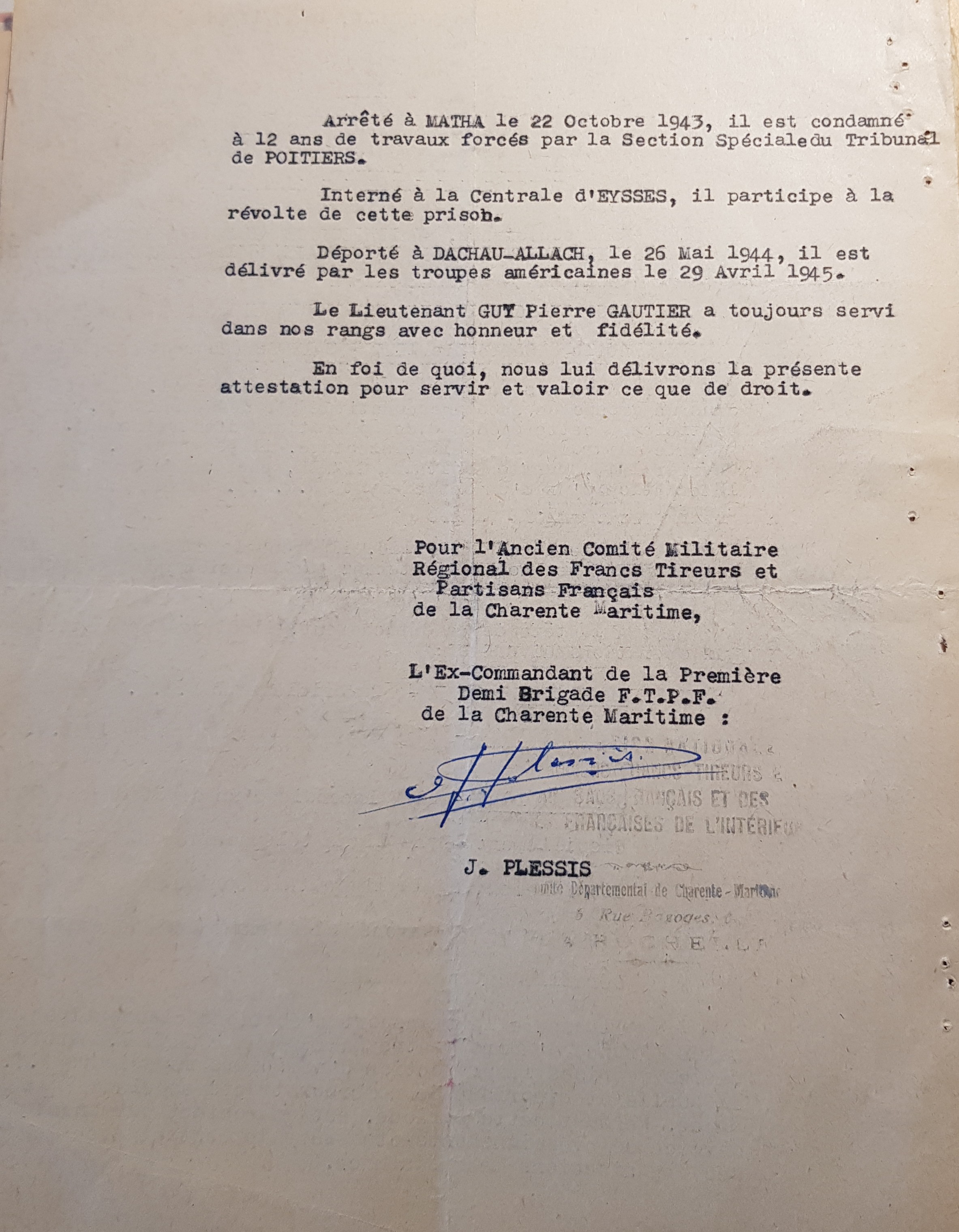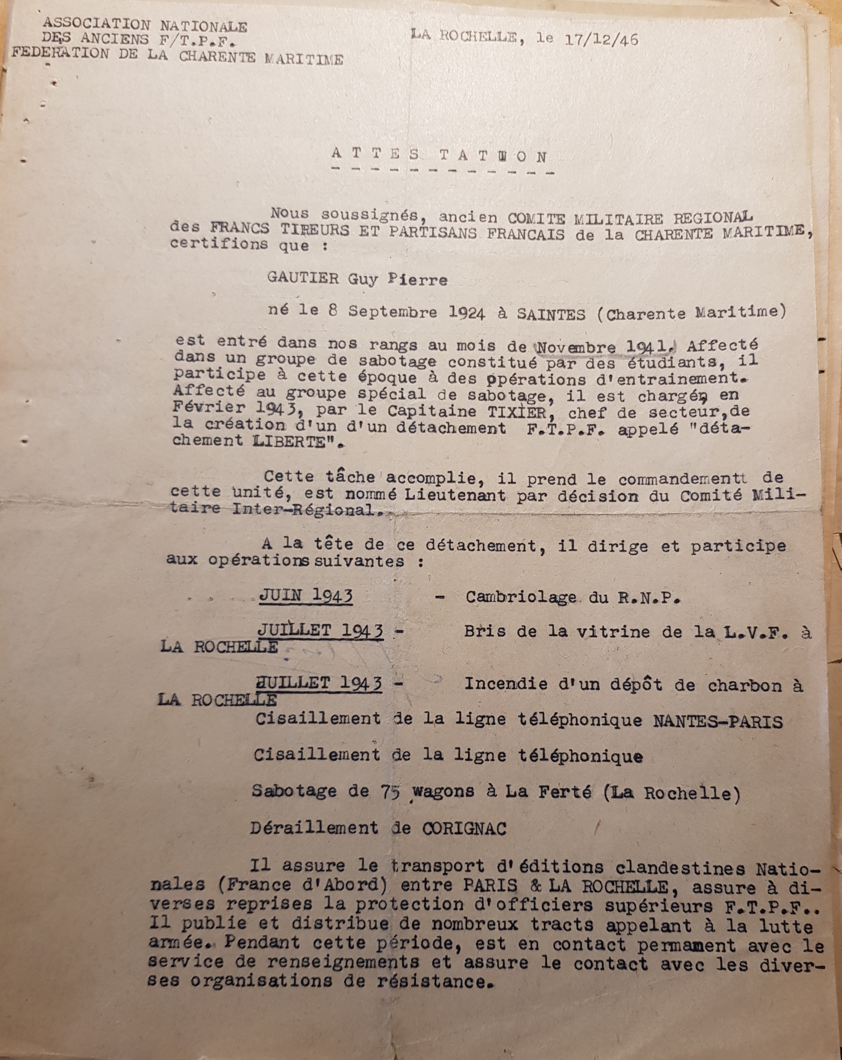 Né à Saintes le 8 septembre 1924, Guy-Pierre Gautier s’engage dans la Résistance à l’âge de 17 ans, au printemps 1943, au contact des jeunes de l’Athlétique ouvrier rochelais.