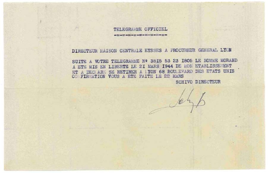 Par décret en date du 14 mars, André Morand bénéficie d’une remise du reste de sa peine avec 5 ans de mise à l’épreuve. Le 21 mars 1944, il est libéré de la maison centrale d’Eysses et réintègre le foyer familial. En l’absence de dossiers le concernant au SHD à Vincennes ou au DAVCC à Caen, on peut supposer qu’il n’a pas eu d’activités résistantes une fois de retour à la vie civile.